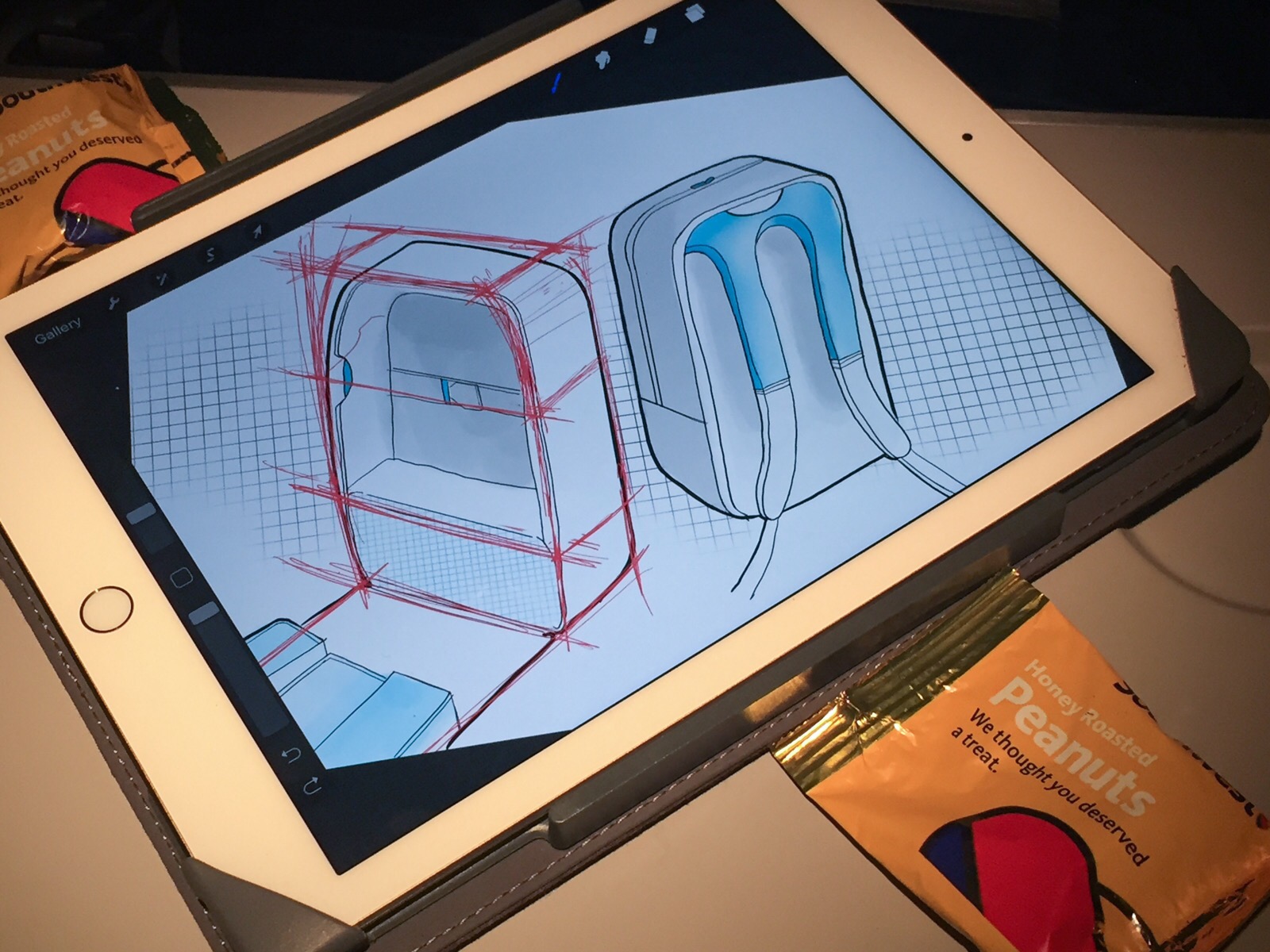 i-pad and procreate great to be able to sketch in small places. The ability to rotate the canvas and not really need to spread out. Perfect for designing backpacks on the plane.