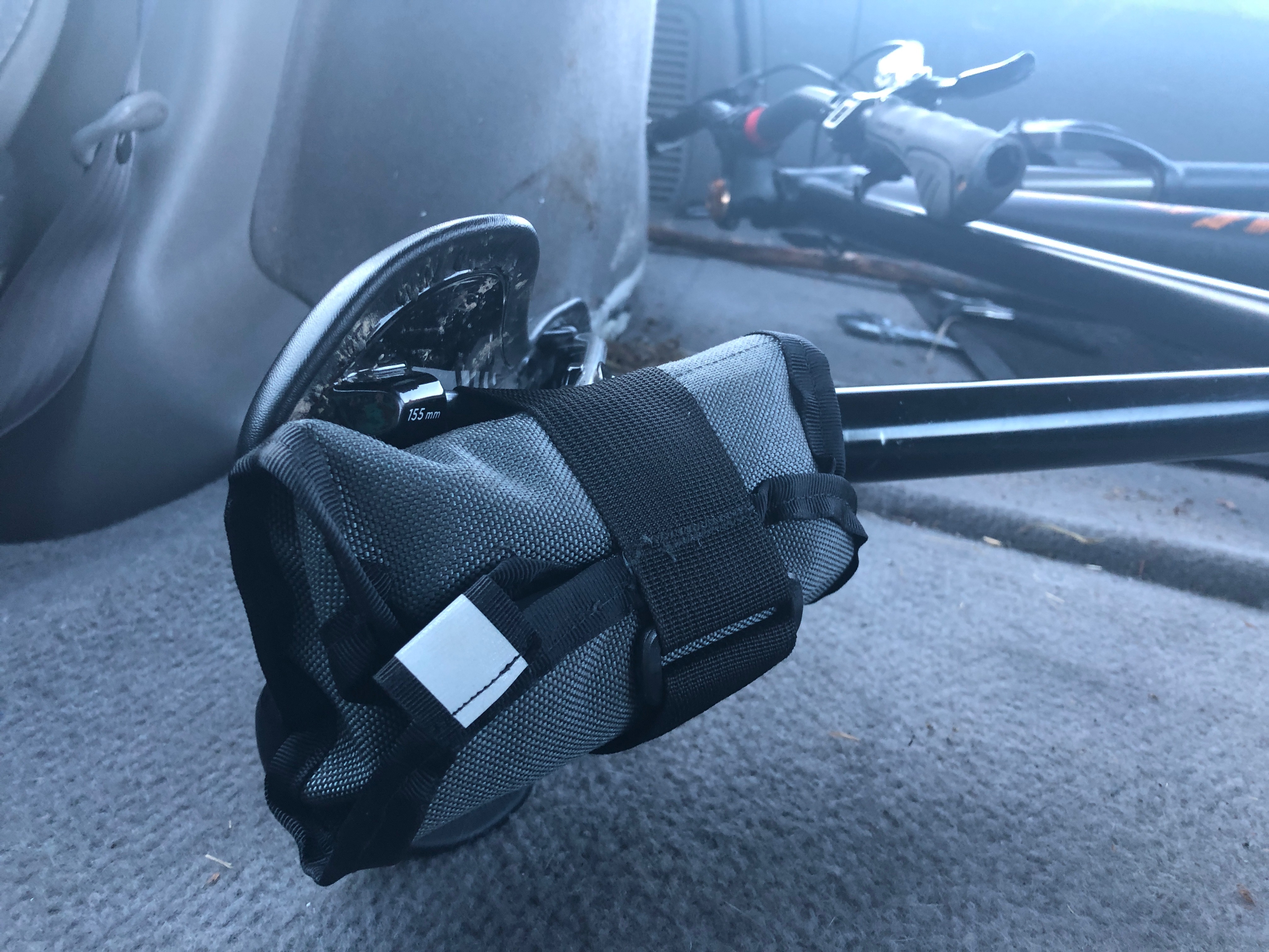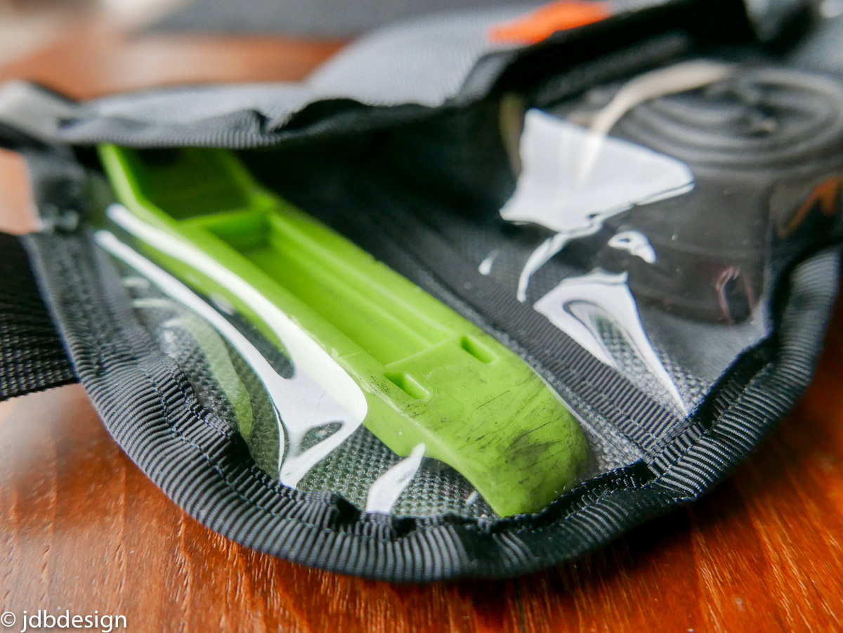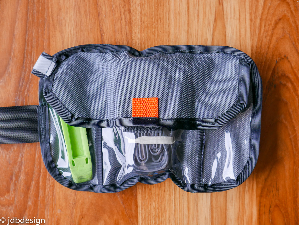 The design was pretty successful, it secured to the bike great, the functionality was spot on. Not stoked about the colors, but it’s material I had around and the transparent pockets seemed to work. This was lot more successful than most similar stage v2 prototypes. Since then I have since modified the design, mainly the shape of the flap to make folding and sewing easier.
