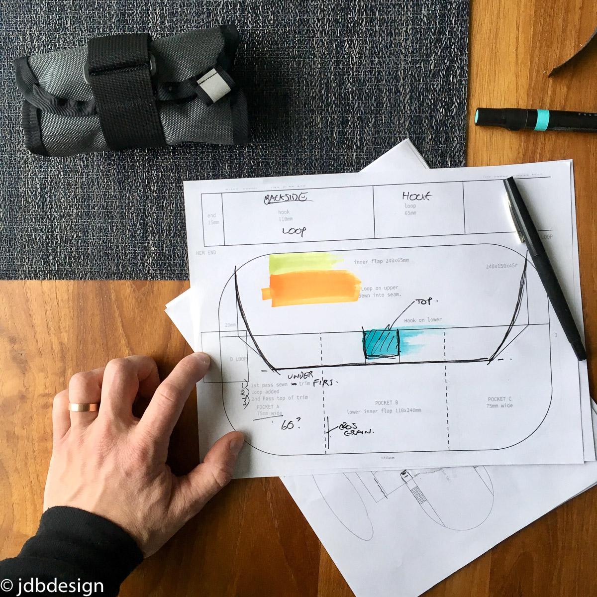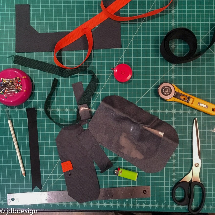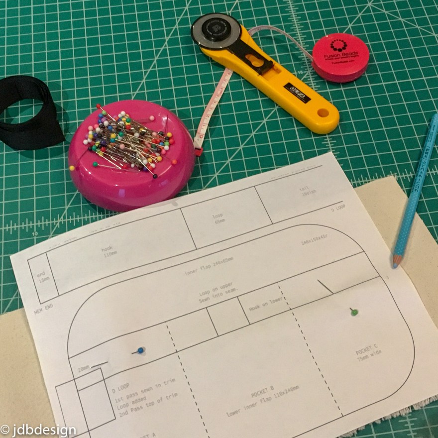I started planning this on paper riffing off my previous design, but this time I was going to wrap a band around the outside to attach to the bike. But the essence was similar, I wanted good access. I drew some basic shapes to scale with the proportions I needed. I folded bits of paper and studied material before moving onto a canvas prototype to dial in sizes and see if my edge new binding would work.