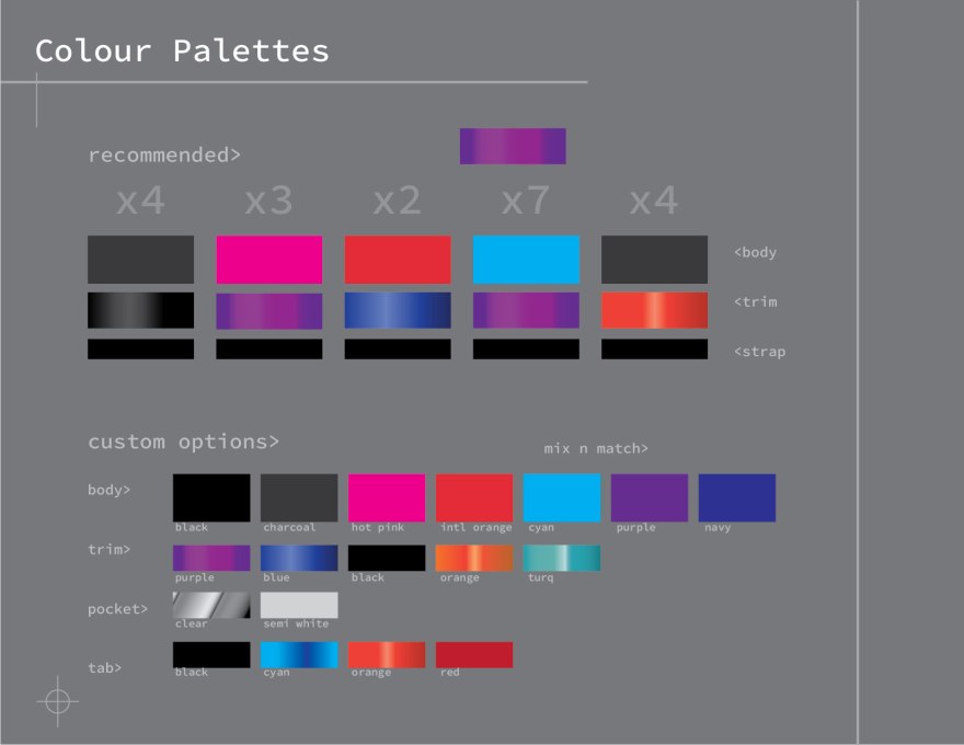 The aesthetic is important and the bike industry has a large emphasis on custom color of accessories and gear, just like the smartphone industry with it’s plethora of cases and finishes. I put together some color pallets using swatches I know of in fabrics that are achievable. My emphasis was on the trendy pop colors of Cyan and Purple but then also some classic combo’s of Navy, Orange, Grey