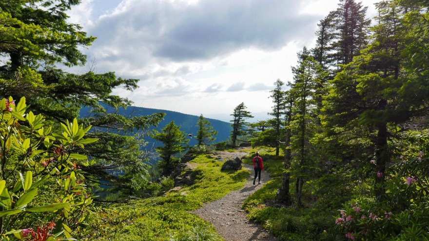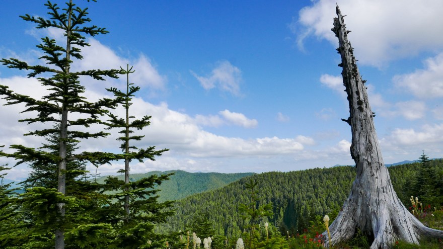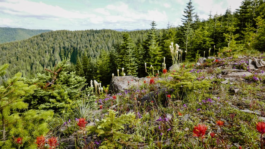 From here, the trail rambles at a moderate grade through handsome, often open forests, with rhododendron and beargrass blooms along the trail in early summer. You will pass a couple unmarked side trails along the way, but keep right to stay on the main trail. Soon, you will reach the junction with the McIntyre Ridge Trail at 1.9 miles. The meadows at the crest of McIntyre Ridge make for a nice destination that is worth visiting on your return trip (described below). For now, continue on the Douglas Trail for 0.6 miles to the short 400 foot spur to the top of Wildcat Mountain. The spur is not marked, so watch for it at the crest of the Douglas Trail—if you’re going downhill, you have missed the summit trail.