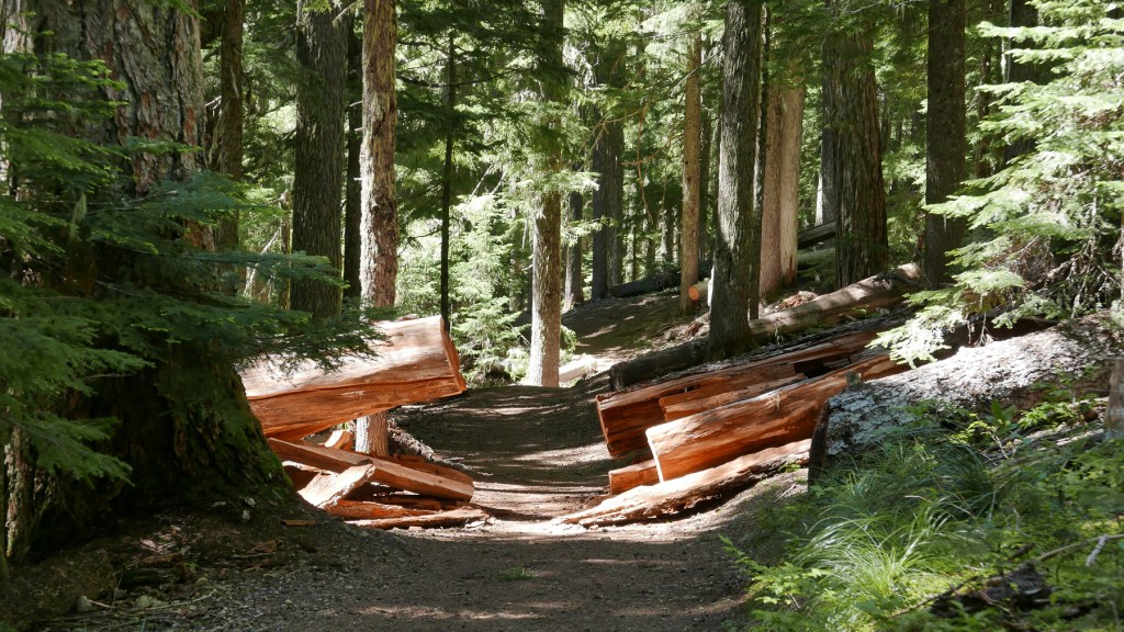 Access to the Pacific Crest Trail #2000 is to the left of the restrooms at the vast Frog Lake Sno-Park. Walk a few yards past a picnic table to a T-junction and go right under mountain hemlocks and silver firs shading a bear-grass carpet. The trail passes the Pacific Crest-Frog Lake Trail Junction, which leads right to Frog Lake. Keep straight in old growth hemlock and Douglas-fir forest with a few western white pines. The Pacific Crest Trail rises gradually and switchbacks at a large western hemlock. Then, continue to traverse upwards to a ridge with a huckleberry/rhododendron/bear-grass understory below tall mountain hemlocks, silver firs and noble firs. Here, reach the Pacific Crest-Twin Lakes Trail South Junction.