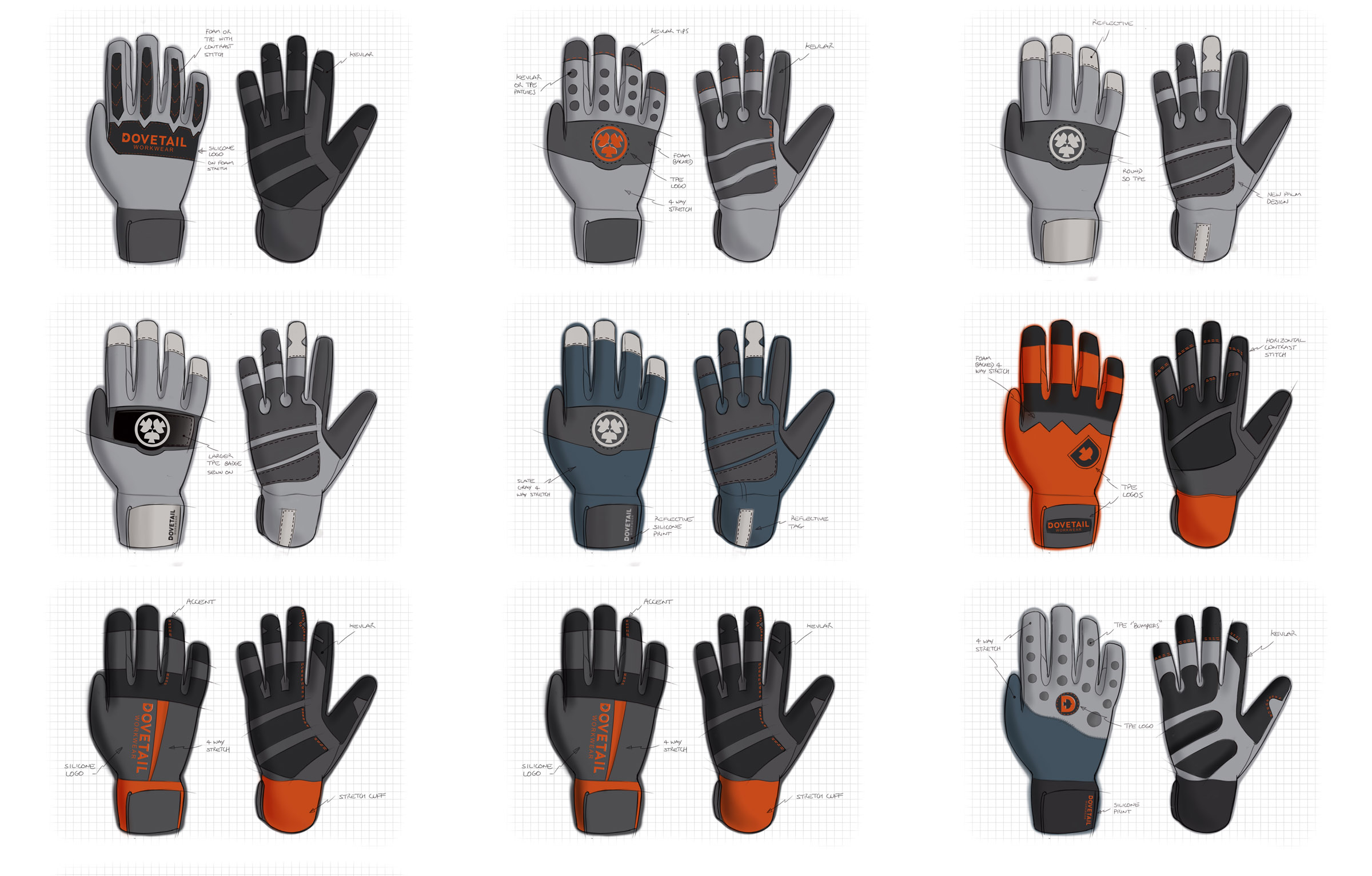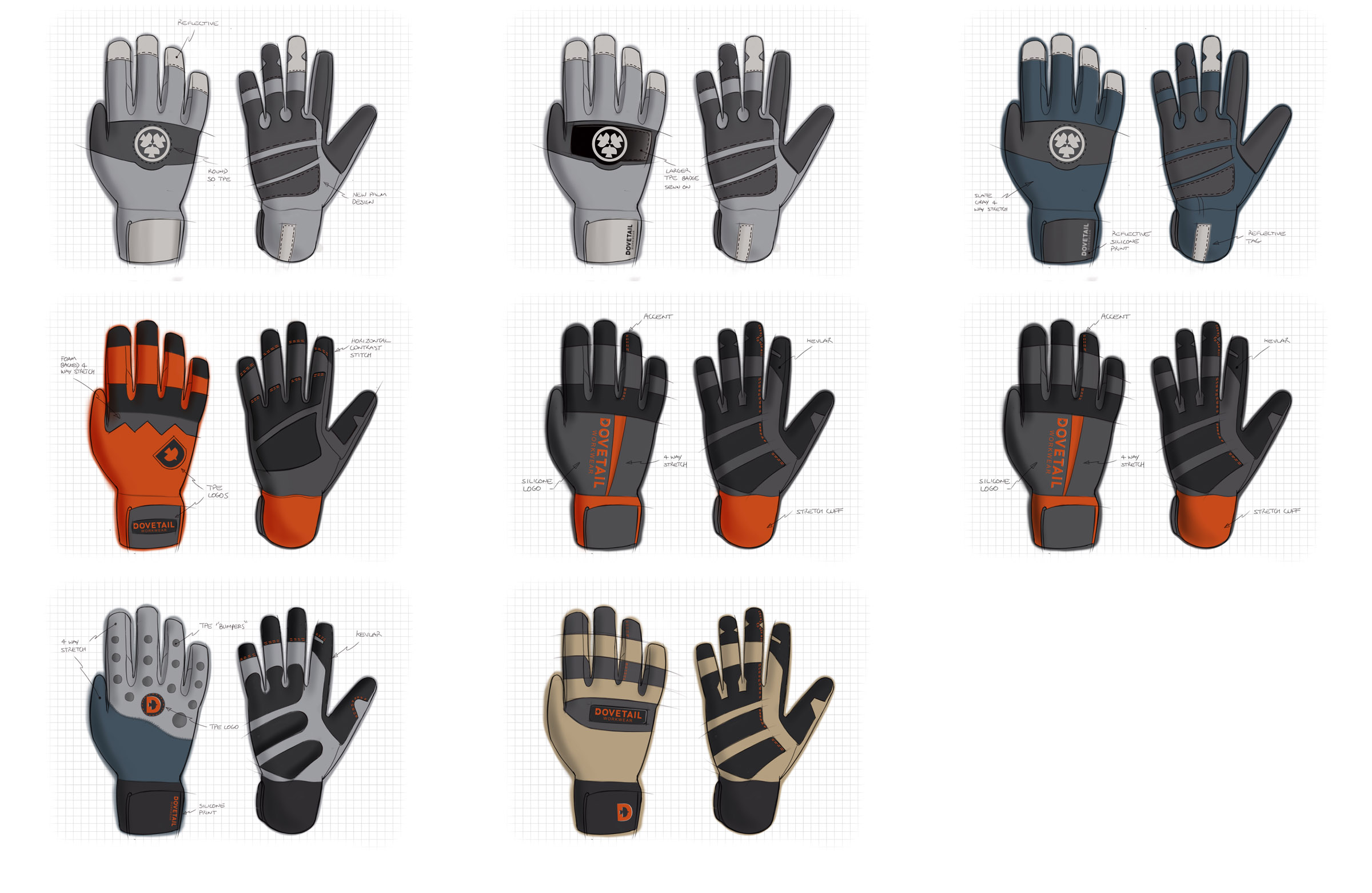 Concept to sample to production. Dovetail Workwear is a new brand that emphasizes workwear. They wanted to introduce a general purpose and a protective glove. We went through 3 rounds of design and into a sample, then refinements.