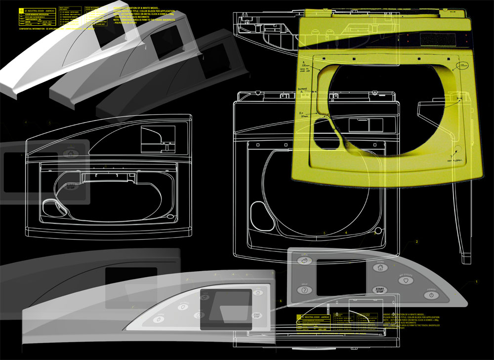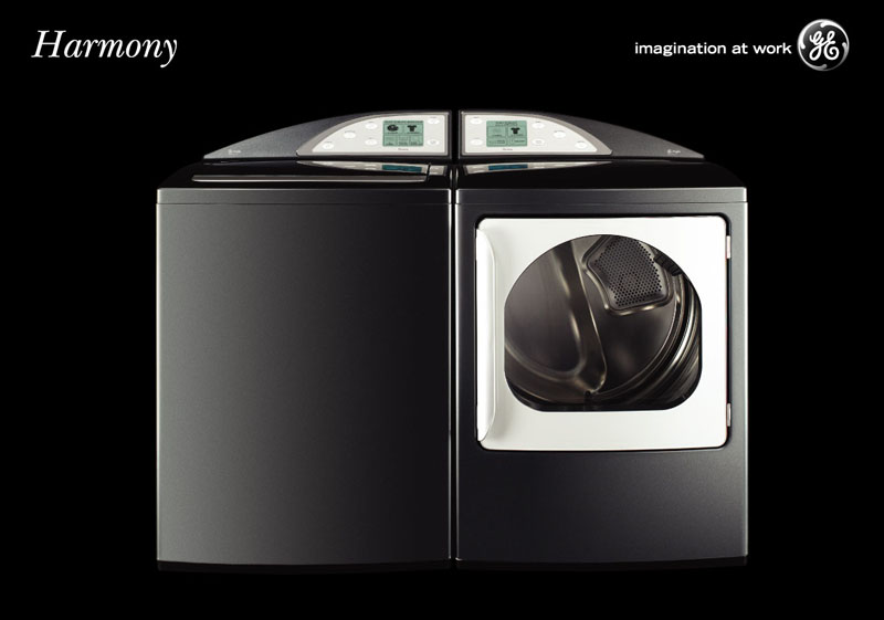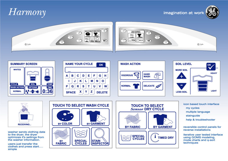 The Harmony was the first GE washer and dryer system with a user touch screen and a visual look that created a unified pair or system. A key design feature, the washer electronically communicating to the dryer, the electronic sensing system helped reduce the chore of doing laundry. This was achieved through advanced sensors and a system approach between the washer and dryer. A large amount of user heuristics, development and testing went into the UI for understanding / maximizing the user benefits of the touchscreen.